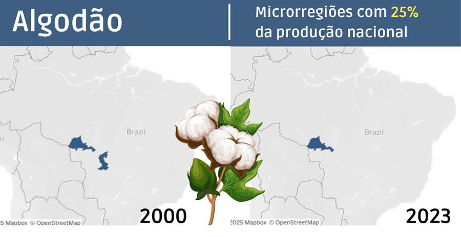 Mas nenhuma cultura é tão específica quanto o algodão. Em 2023, a região de Parecis (MT) respondia sozinha por 25% da produção nacional. Antes, em 2020, o G25 era dividido também com Primavera do Leste e Rondonópolis, MT – o que também mostrava alta concentração.