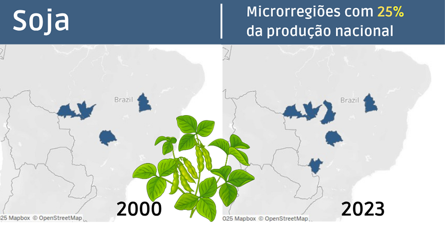 A produção de soja cresceu e se expandiu pelo território nacional. A concentração concentrada, mas regiões com forte produção em 2000 concentrada entre as de maior destaque. Naquele ano, Parecis (MT), Alto Teles Pires (MT), Barreiras (BA) e Sudoeste de Goiás (GO) responderam por 25% da produção nacional. Em 2023, a fatia passou a ser dividida com Canarana (MT) e Dourados (MS).