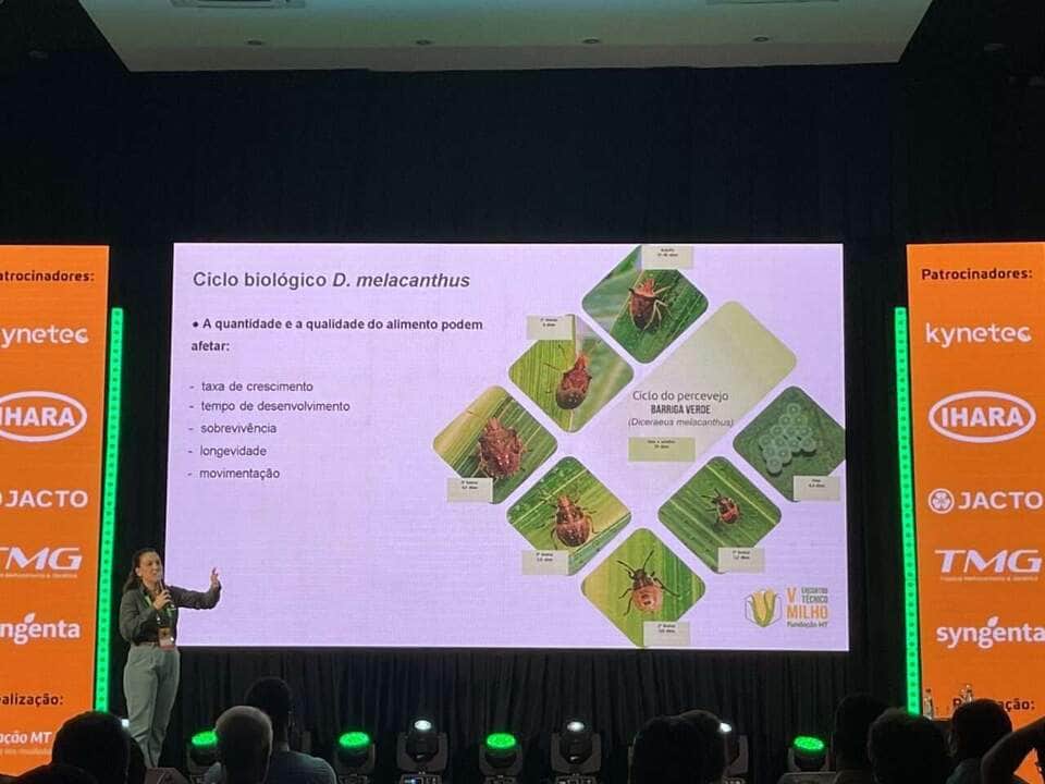 A supervisora de pesquisa da Fundação MT, Mariana Ortega, alertou para a importância de um manejo integrado do percevejo barriga-verde, considerando todo o sistema de produção, desde a soja até o milho.