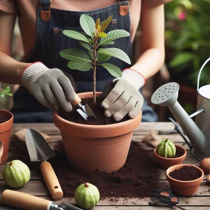 Por ser uma árvore frutífera que pode ter mais de dez metros, escolha um recipiente grande e com boa capacidade de litragem. Insira terra nutrida e com calcário no vaso e em seguida, coloque sua muda. Uma dica também é colocar ao lado da muda uma estaca e amarrar as duas juntas para dar suporte à planta.