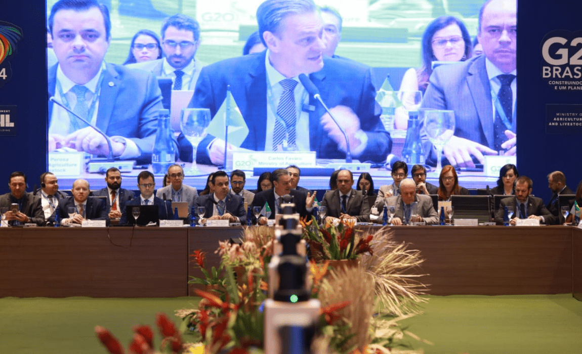 Fávaro também ressaltou a importância do tema do G20 escolhido pelo Brasil: “Construindo um mundo justo e um planeta sustentável”. “A maior de todas as degradações do ser humano é a fome. O Brasil escolheu um tema muito certeiro e que tem uma relação muito clara com o nosso GT. É uma das obstinações do presidente Lula o combate à fome”. Ele completou reforçando que o Brasil conta com homens e mulheres vocacionados para a terra, afirmando que esses são grandes ativos do país, mas que o maior ativo de todos é o clima, e que é necessário reforçar o compromisso com a produção sustentável.