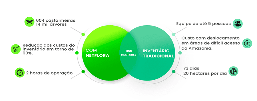 No entanto, com a adoção do NetFlora, essa realidade mudou rapidamente. “Atualmente, é possível mapear até 3.500 hectares por dia e produzir informações detalhadas sobre o inventário florestal, como reconhecimento de espécies, localização geográfica, métricas e mapas, em uma velocidade de 2 hectares por segundo”, complementa.