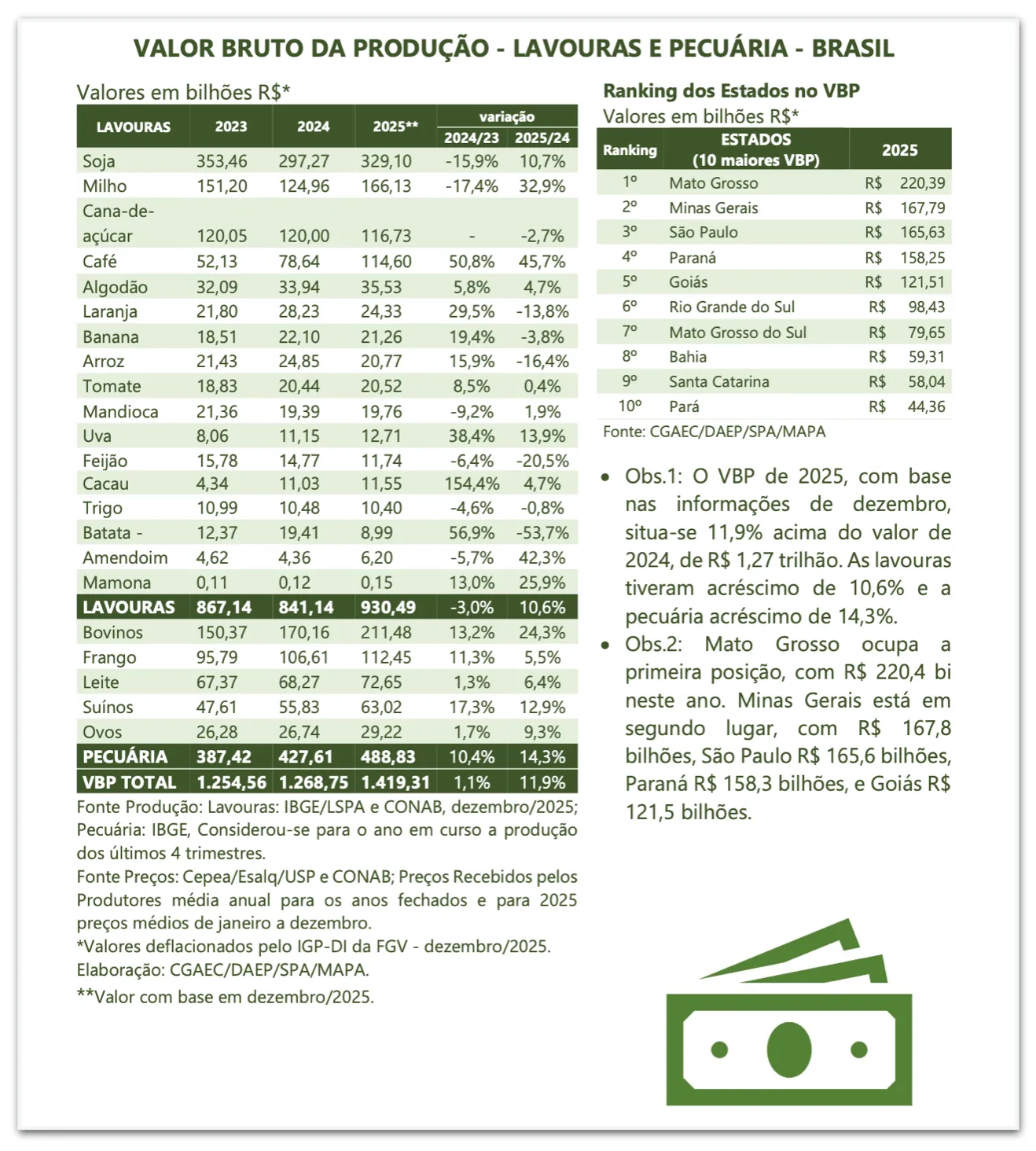 Contexto: O VBP mede o faturamento bruto das atividades, funcionando como um termômetro da saúde financeira das fazendas. A concentração de 15,5% em um único estado mostra que Mato Grosso é o polo mais competitivo e estruturado do mundo no agronegócio atual.