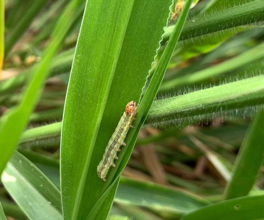 Outra bastante comum em pastagens é a lagarta militar. Apesar de iniciar também raspando as folhas, esta, à medida que se desenvolve, corta a partir do centro, deixando buracos nas folhas. A principal característica que a difere das outras lagartas é a presença de um Y invertido na cabeça. Em altas infestações possui comportamento de canibalismo, sendo raramente vistas juntas.