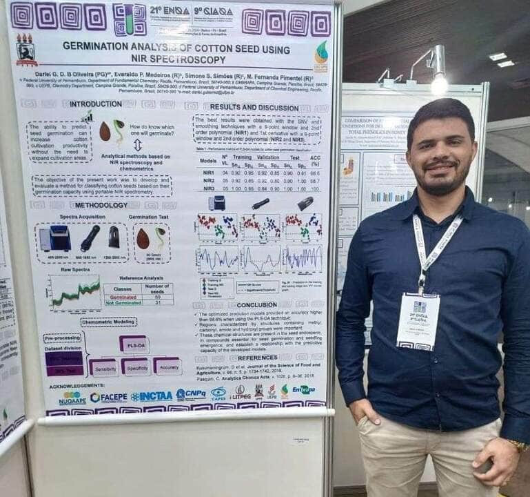Uma pesquisa sobre análise de germinação de sementes de algodão utilizando espectroscopia de infravermelho próximo (NIR), realizada pelo estudante de doutorado do Programa de Pós-Graduação em Química da Universidade Federal de Pernambuco ( UFPE ) Darlei Gutierrez Oliveira, sob orientação da professora Maria Fernanda Pimentel ( UFPE ) e o pesquisador da Embrapa Algodão Everaldo Medeiros e coorientação da professora Simone Simões (UEPB) foram premiados em congresso internacional. O doutorando Darlei Oliveira recebeu a premiação de segundo melhor retrato da categoria Quimiometria apresentada durante o 21º Encontro Nacional de Química Analítica ( ENQA ) e o 9º Congresso Ibero Americano de Química Analítica (CIAQA), realizados em setembro, em Belém, PA.