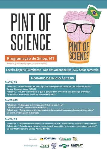 Depois de ficar fora do calendário do Pint of Science do ano passado, Sinop voltará a sediar o festival que faz a divulgação científica em bares e restaurantes. A programação será nos dias 19, 20 e 21 de maio, na Choperia Palmitense.