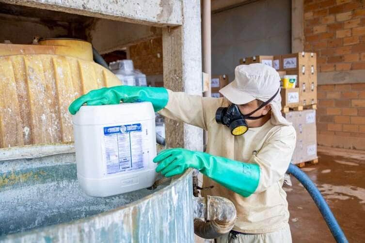 “O processo que ocorre aqui na fazenda começa com a utilização dos produtos na lavoura e, no momento em que os vasilhames são esvaziados, nós realizamos a tríplice lavagem. Logo após, a embalagem é inutilizada, ou seja, é realizada uma perfuração, normalmente no fundo do galão, para evitar qualquer reuso indevido. Em seguida, nós guardamos em um depósito para ser encaminhado ao local adequado”, explica Stéfano Passinato.