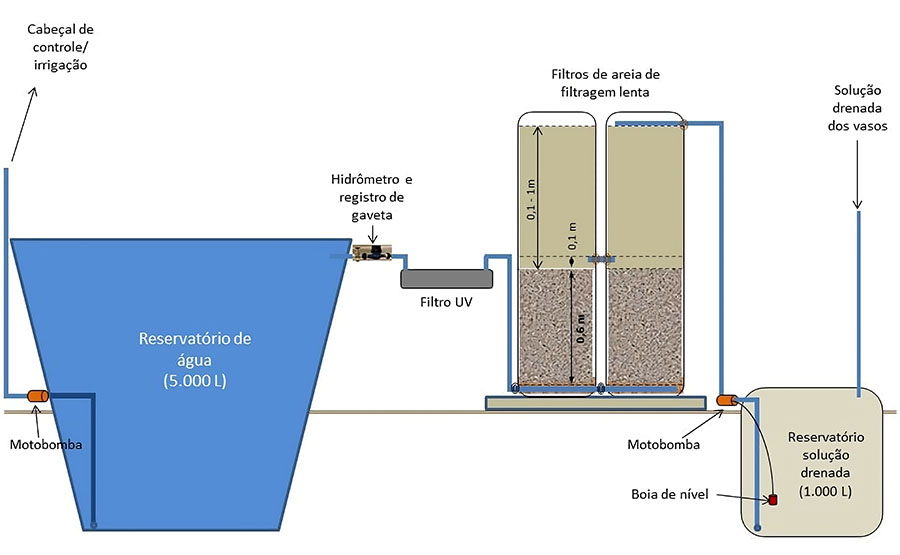 A tecnologia é composta por filtros com leito de areia fina, de filtragem lenta, instalados em paralelo, seguidos de um esterilizador ultravioleta (UV) e reservatórios para o armazenamento da solução recolhida dos vasos de cultivo e da solução tratada. A solução nutritiva é coletada por meio de calhas de polipropileno (plástico leve e resistente), posicionadas sob os vasos de cultivo, que levam o produto para um tanque reservatório. Quando esse tanque enche, a solução é bombeada para os filtros de areia, para tratamento de impurezas e desinfecção.