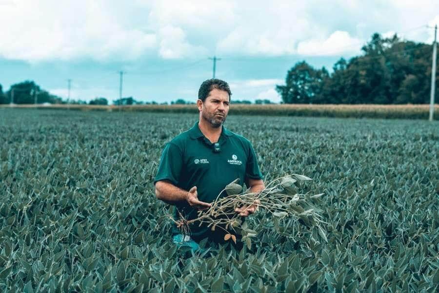 Fernando Ferri dentro de uma lavoura de soja norte-americana (Foto: Leandro Andrade/ Fábrica Onze)