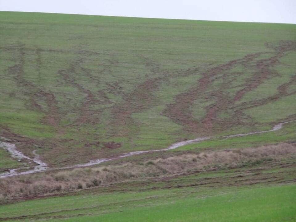 Embora a cobertura do solo dissipe a energia erosiva do impacto das gotas de chuva, em um determinado trecho se torna insuficiente para prevenir a erosão. Isso ocorre porque a água não infiltrada no solo se transforma em enxurrada e passa a escoar sob a cobertura do solo, produzindo energia erosiva cisalhante ou de retenção, com potencial de superar a tensão de cisalhamento do solo e desencadear processos erosivos. Mantendo-se constantes todos os fatores relacionados à incidência e à dissipação da energia erosiva da chuva e aumentando-se apenas o comprimento da vertente, tanto a velocidade quanto o volume de enxurrada produzido por determinada chuva elevam o risco de ocorrência de erosão. Em outras palavras, a cobertura do solo é capaz de dissipar em até 100% a energia de ação do impacto das gotas de chuva, mas não revela essa mesma eficácia para dissipar a energia de ação cisalhante ou de atração produzida pela enxurrada que flui sob a vegetação que cobre o solo.
