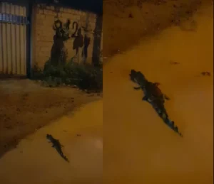 Jacaré ‘passeia’ por rua alagada pelas chuvas em Boa Vista e moradores registram: ‘como se fosse nosso vira-lata’