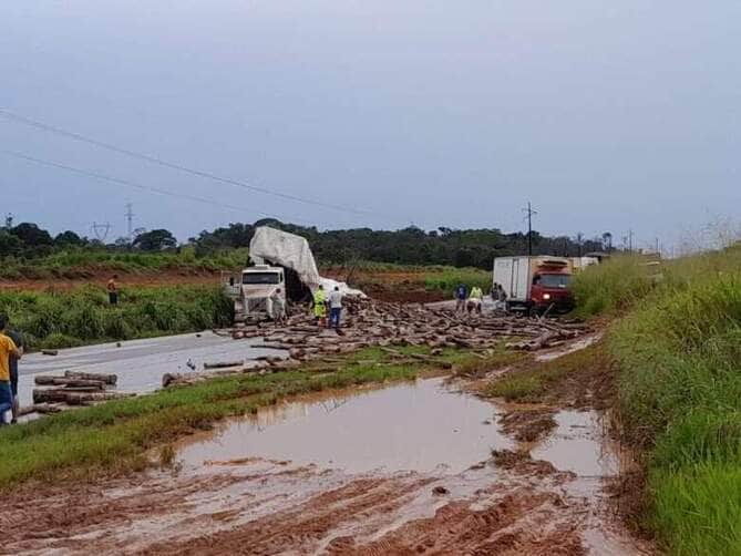 Caminhão derrama carga de madeira na BR-163 em Sorriso e pista opera em sistema Pare e Siga