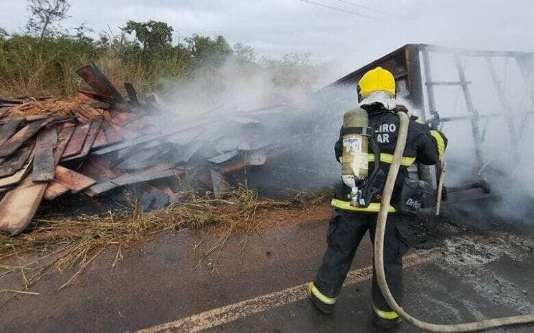 Incêndio destrói parte de carreta carregada com tábuas e interdita MT-249 entre Nova Mutum e Campo Novo