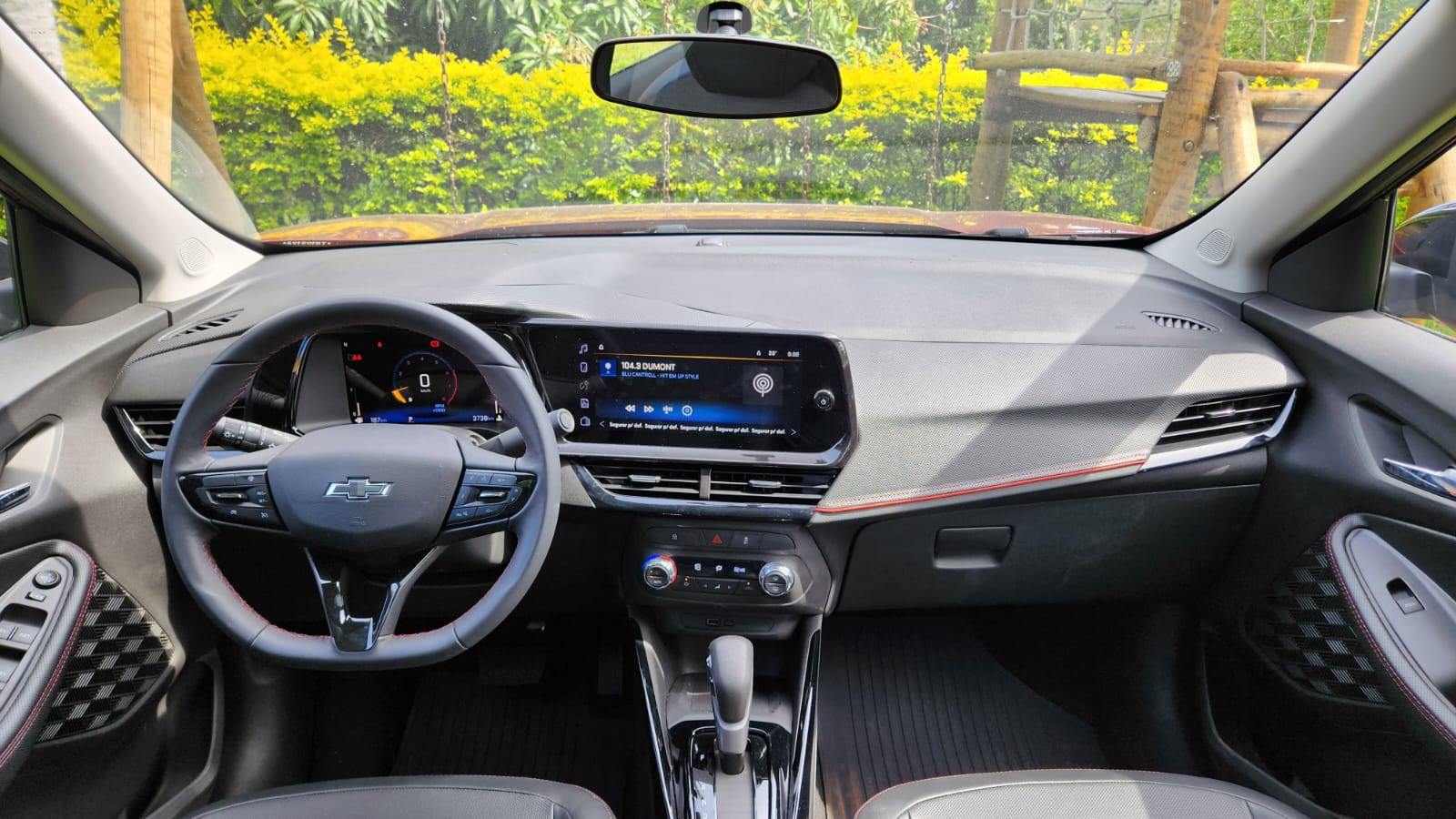O interior da versão RS Turbo concentra os principais diferenciais da linha. O painel de instrumentos digital de 8 polegadas e a central multimídia MyLink de 11 polegadas formam o conceito de cockpit virtual da Chevrolet, com interface direta e rápida. A câmera de ré digital de alta resolução facilitou manobras em ambientes urbanos, enquanto os bancos, o volante e os comandos apresentaram ergonomia adequada ao uso diário.
