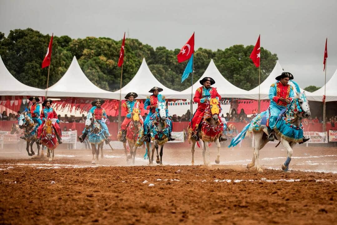 Além de mergulhar na história, o público acompanha um espetáculo de cultura e beleza. A encenação composta por dois grupos participantes, 12 Mouros e 12 Cristãos, traz cavaleiros e pajens com ricas vestimentas e adereços, e cavalos enfeitados com adornos singulares em lutas sucessivas ao som percussionista do repique na arena.