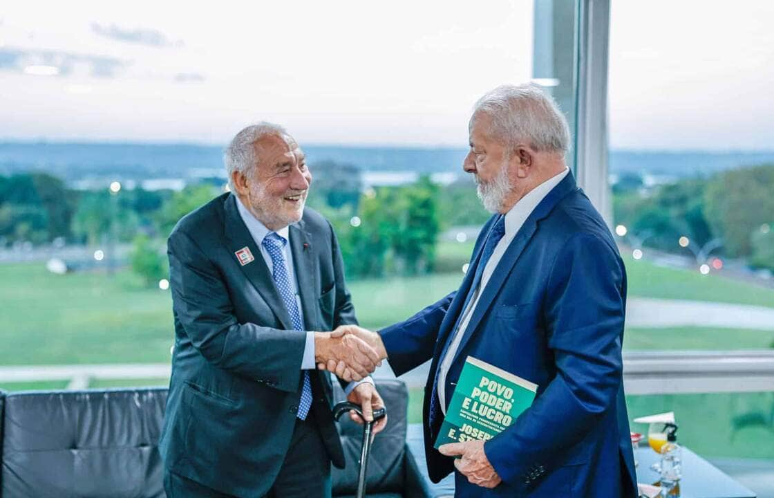 O presidente Luiz Inácio Lula da Silva recebeu, na tarde desta quarta-feira (13), no Palácio do Planalto, em Brasília, economista Joseph Stiglitz, professor da Universidade de Columbia, nos Estados Unidos, e ganhador do Prêmio Nobel de Economia. Segundo a assessoria de Lula, o presidente agradeceu as menções positivas de Stiglitz sobre a reforma fiscal, os resultados recentes da economia e o aumento na geração de empregos, além da reativação de programas sociais e investimentos em obras de infraestrutura, retomados pelo atual governo.
