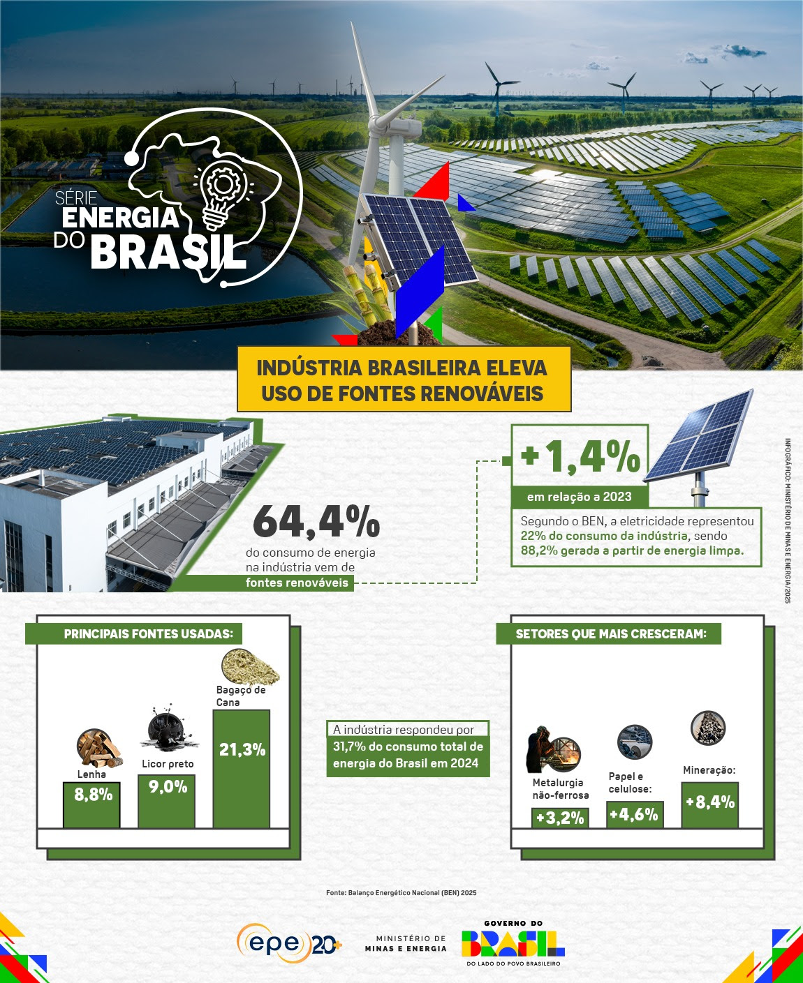 Segundo o Balanço Energético Nacional (BEN) 2025, a indústria utilizou 64,4% de energia renovável em 2024, praticamente o mesmo índice de 2023 (64,7%).
