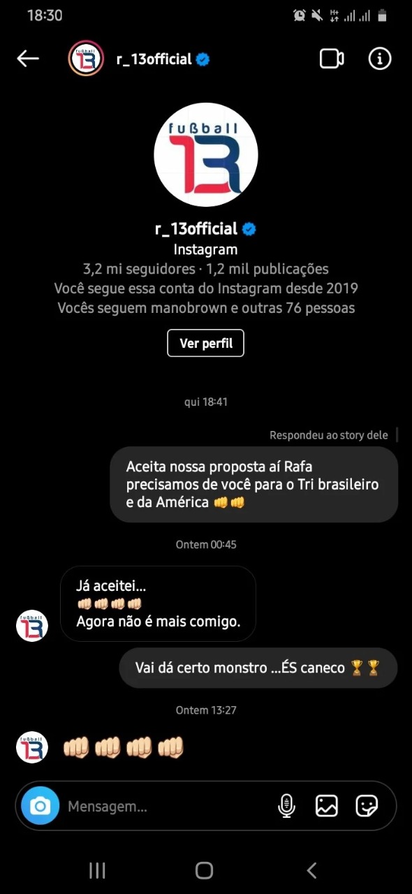 O lateral campeão brasileiro e da Libertadores com o Flamengo voltou a alvoroçar a torcida do Flamengo, dessa vez através de uma conversa pelo Instagram onde ele diz “Já aceitei (a proposta). Agora não é mais comigo” a um torcedor que pediu para ele aceitar a proposta do Flamengo.