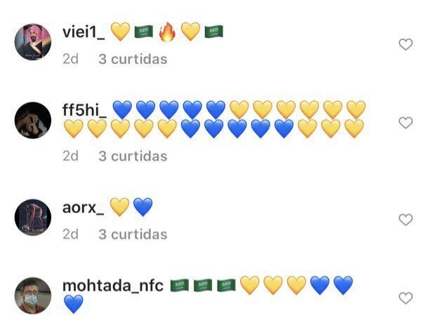Utilizando o inglês como idioma, os torcedores imploraram pela transferência. “Por que você não vem para o AlNassr? Eu juro que é o melhor clube de todos os tempos e ficaremos felizes em vê-lo jogar. Os fãs estão muito animados“. “Esperamos que você aceite a oferta e venha para a Arábia Saudita. Viver na Arábia Saudita é uma coisa linda e um povo lindo“, disse outro. Todas as mensagens são acompanhadas de respostas dos torcedores do Fla.