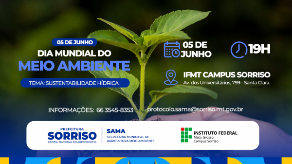 Com o foco em debater soluções ambientais sustentáveis, a Prefeitura de Sorriso e o Instituto Federal de Mato Grosso (IFMT) deram o start às ações do Dia Mundial do Meio Ambiente 2025. A inscrição é gratuita e gera certificado digital de quatro horas. O encontro será no dia 5 de junho com credenciamento às 18h30 e palestras a partir das 19 horas no auditório do Instituto Federal de Mato Grosso (IFMT), Campus de Sorriso.