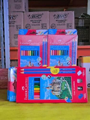 Para se ter uma ideia, estão disponíveis 44.130 caixas de lápis de cor Faber Castell, 30.130 caixas de massa de modelar Acrilex, 49.874 apontadores com depósito Faber Castell, 42.394 canetas esferográficas Bic, 149.622 lápis preto sextavado Faber Castell, além de cola branca Compactor, giz de cera Acrilex, tinta guache Acrilex, canetinha hidrocor Compactor, borracha, entre outros. Os kits entregues variam de acordo com as séries dos alunos, mas, em geral, contêm cola, lápis de cor, lápis de escrever, borracha e apontador.