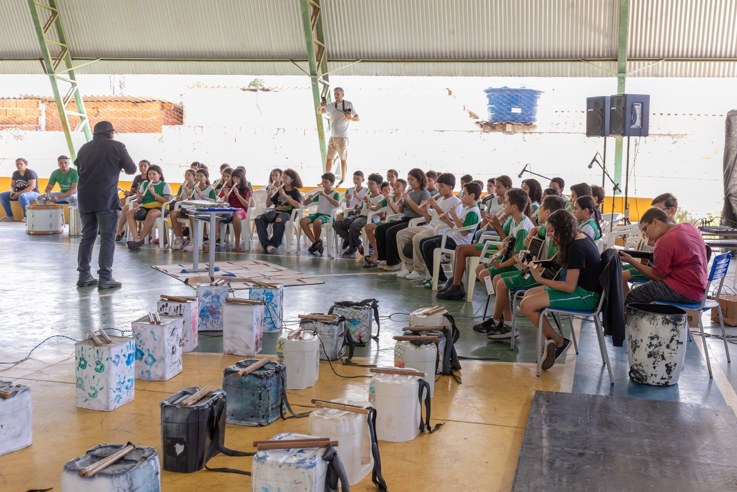Alunos e professores formaram a ciranda do rock. Também houve uma apresentação de skate na quadra. No espaço, havia ainda tambores com materiais recicláveis produzidos pelos estudantes, com detalhes em tinta. Violões, antes em estado precário, foram pintados de branco e receberam pintura das mãos das crianças e adolescentes.