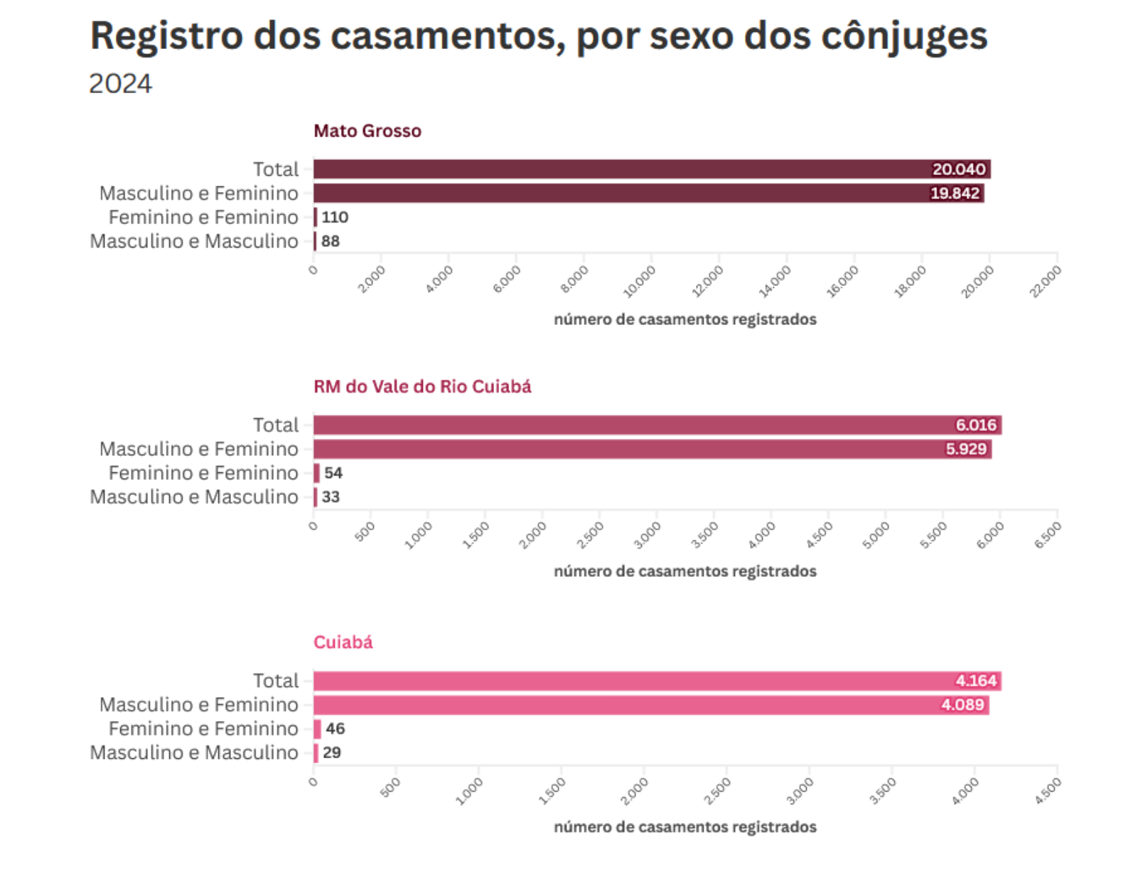 Apesar da retração, Mato Grosso permanece entre os estados onde os brasileiros mais se casam: a taxa de nupcialidade foi de 6,8 casamentos por mil habitantes com 15 anos ou mais, superando a média brasileira (5,6‰) e se mantendo como a 6ª maior do país.