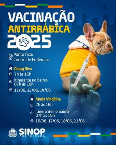 A Prefeitura de Sinop, por meio do Centro de Combate às Endemias, inicia campanha de vacinação antirrábica de gatos e cachorros. A ação será realizada até o dia 21 deste mês em, ao menos, três pontos. No Residencial Daury Riva e Jardim Maria Vindilina serão realizados de maneira itinerante. O centro de endemias, localizado na avenida das Itaúbas, nº 4.765, Jardim das Palmeiras, é ponto fixo e o atendimento será no horário das 7h às 16h.