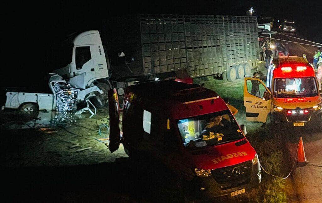 Haviam três pessoas presas entre as ferragens da camionete, sendo dois adultos, que não resistiram aos ferimentos causados pelo acidente, e uma criança que apresentou ferimentos graves.