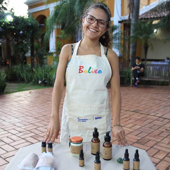 Desde que começou a ter interesse por uma vida mais saudável e alinhada com a sustentabilidade, Cecília Viveiros, de 28 anos, passou a prestar atenção nos produtos que utilizava no dia a dia. Ao identificar que um antitranspirante de uma marca conhecida não gerava um efeito satisfatório, em 2019 teve a ideia de criar sua própria linha de itens naturais, chamada Natureza Raiz. Hoje, comercializa os cosméticos veganos no Bulixo do Sesc Arsenal, que ocorre todas às quintas-feiras, na unidade do Serviço Social do Comércio (Sesc-MT).