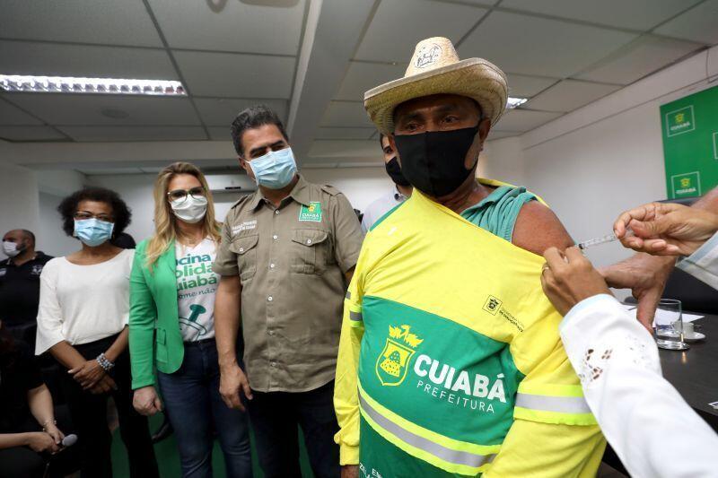 O prefeito de Cuiabá, Emanuel Pinheiro, deu início nesta segunda-feira (3), a vacinação dos garis, carroceiros, trabalhadores do serviço de varrição, motoristas de transporte coletivo e catadores de recicláveis. A solenidade simbólica foi acompanhada pela primeira-dama de Cuiabá, Márcia Pinheiro, e realizada no auditório da Prefeitura de Cuiabá.