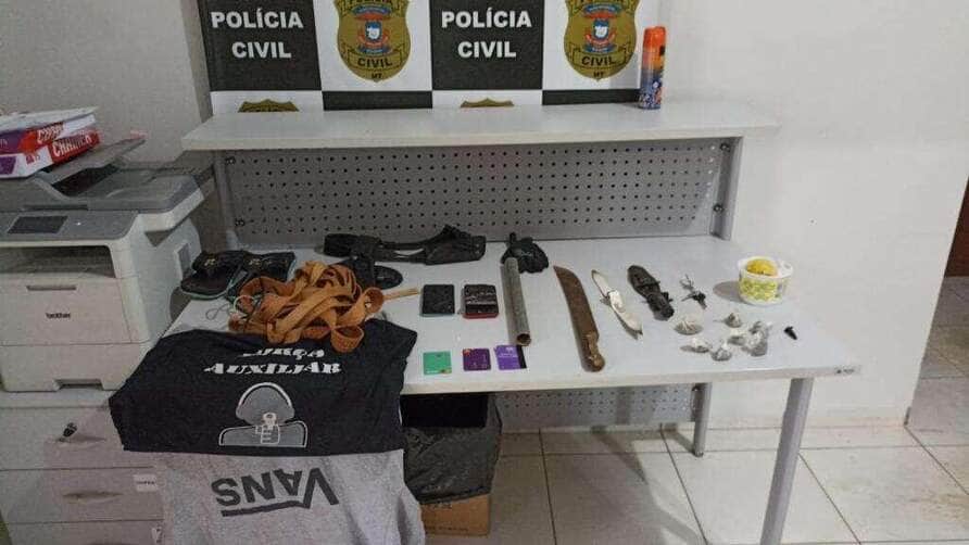 Durante as diligências, a equipe da DHPP localizou e prendeu o suspeito ao sair de sua residência. Na abordagem, foram apreendidos dois celulares (um danificado), um chip de operadora, a motocicleta utilizada na ação criminosa, uma sacola contendo cordas, fios, sete porções de maconha prontas para venda, embalagens plásticas, um pino com resquício de entorpecente, além de um cinto tático com coldre, faca, ferro pontiagudo, luva, camisetas (uma com a inscrição “Força Auxiliar”), chinelo, facão e uma barra de ferro.