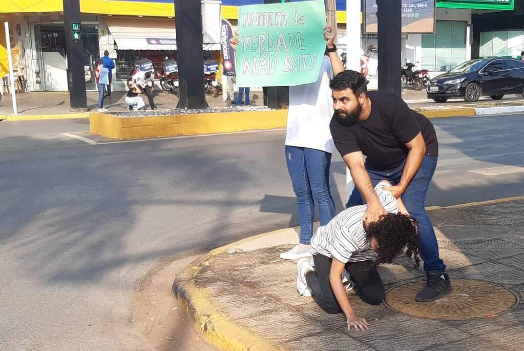 A intervenção artística aconteceu no cruzamento das Avenidas Mato Grosso com a Paraná. Além dos atores que interpretaram dois casais em que os homens simulavam agressões às companheiras, duas atrizes mostravam cartazes condenando a violência contra mulher. Agentes da Guarda Civil Municipal acompanharam a encenação.