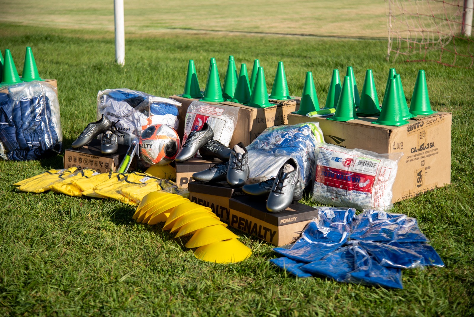 A Prefeitura de Rondonópolis por meio da Secretaria de Educação, Cultura, Esporte e Lazer realizou a entrega de materiais esportivos para três escolinhas de futebol do município nesta terça-feira (21) no Estádio Luthero Lopes. As crianças receberam chuteiras, uniformes e coletes, enquanto os professores foram contemplados com kits completos de treino, contendo bolas, redes, cones, bombas para inflar e outros equipamentos.