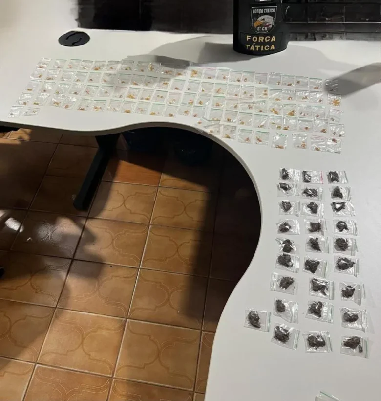 A equipe, que realizava rondas no município, avistou os homens em atitude suspeita. Ao perceberem a aproximação dos policiais, a dupla fugiu para os fundos de uma casa, onde foi localizada uma sacola contendo 100 porções de pasta base de cocaína e 28 porções de maconha. Durante as buscas na residência, foi encontrado um talão de água, que indicou que o proprietário do imóvel está preso por envolvimento com o tráfico de drogas.