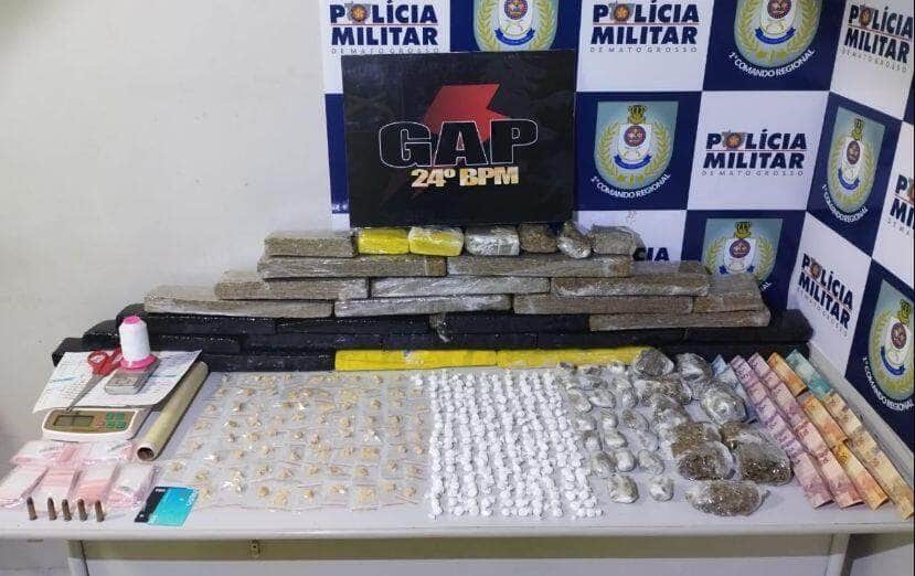 Ao verificar a mochila, a equipe do 24º BPM encontrou diversas porções de drogas, totalizando 201 porções de cocaína, 77 porções de pasta base e 37 porções grandes e pequenas de maconha.