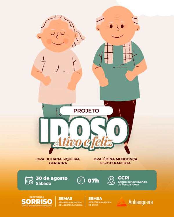 Envelhecer com saúde é manter o corpo em movimento e o coração conectado com outras pessoas. E para descobrir como tornar a jornada do envelhecimento uma experiência mais ativa, plena e feliz, o Centro de Convivência da Pessoa Idosa (CCPI) de Sorriso recebe neste sábado, 30 de agosto, mais uma edição do projeto “Idoso Ativo e Feliz”, com a participação da médica geriatra Dra. Juliana Siqueira e a fisioterapeuta Dra. Édina Mendonça, que abordarão temas essenciais para um envelhecimento saudável.