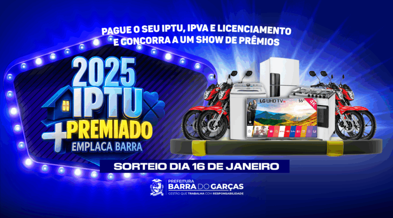 A Prefeitura de Barra do Garças, através da Secretaria de Planejamento e Finanças, comunica que os cupons de sorteio da campanha “IPTU Premiado e Emplaca Barra” já estão disponíveis para retirada. Desta vez, serão sorteados dez super prêmios: 05 (cinco) motos 160 cilindradas; 01 (uma) geladeira de 410 litros; 01 (um) fogão de cinco bocas; 01 (uma) máquina de lavar roupas de 12 kg; 01 (uma) TV 55 polegadas; e 01 (um) ar condicionado de 12 mil btus.