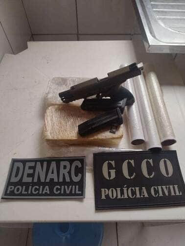 Durante revista ao ambiente, os policiais identificaram um fundo falso sob o piso de um quarto, possivelmente utilizado para armazenamento das drogas, exatamente como relatado nas denúncias. No mesmo quarto foi localizado uma pistola com numeração suprimida, calibre 9mm, com dois carregadores, sem munições e um aparelho celular, que a jovem não soube dizer a quem pertencia.