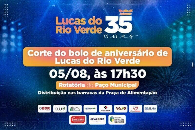 Para cantar os parabéns com toda a população, a Prefeitura de Lucas do Rio Verde realizará o tradicional corte do bolo. A celebração é gratuita e será neste sábado, dia 05 de agosto, a partir das 17h, na rotatória da Prefeitura.