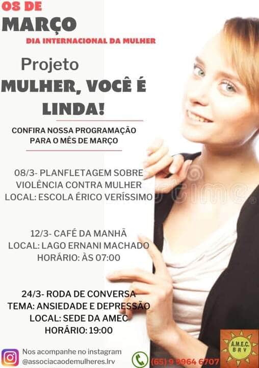 Três eventos serão realizados pela Associação de Mulheres em Busca de Cidadania em Lucas do Rio Verde para marcar o mês de março. Uma delas acontecerá no dia Internacional da Mulher, em 8 de março.