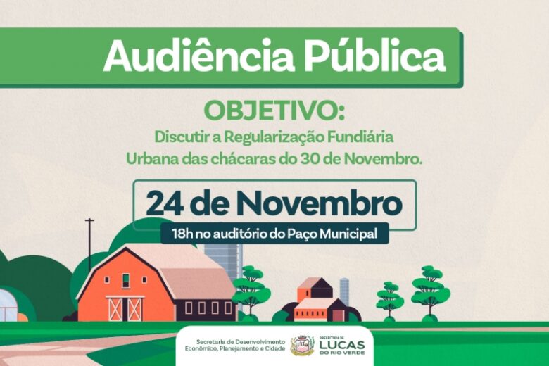 A Prefeitura de Lucas do Rio Verde, por meio da Secretaria de Desenvolvimento Econômico, Planejamento e Cidade, convida a população para participar da Audiência Pública que discutirá a Regularização Fundiária Urbana das chácaras da Comunidade 30 de Novembro. O evento será realizado na próxima segunda-feira, dia 24 de novembro, às 18h, no Auditório dos Pioneiros, localizado no Paço Municipal.