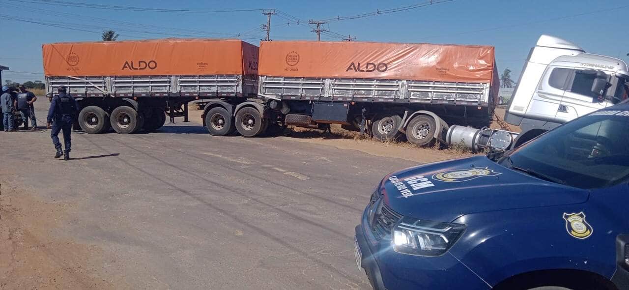 Durante rondas de rotina neste domingo (29), a equipe da Guarda Civil Municipal se deparou com um caminhão acidentado, caído em uma valeta na Avenida da Produção, em frente ao armazém Binotti, nas proximidades do acesso à BR-163, em Lucas do Rio Verde (MT).