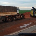 Uma colisão envolvendo três veículos de carga interditou completamente a BR-163, em Lucas do Rio Verde, no início da tarde desta terça-feira (11). O acidente foi registrado por volta das 13h30, no km 649 da rodovia, após a comunidade rural São Cristóvão, sentido a Nova Mutum.