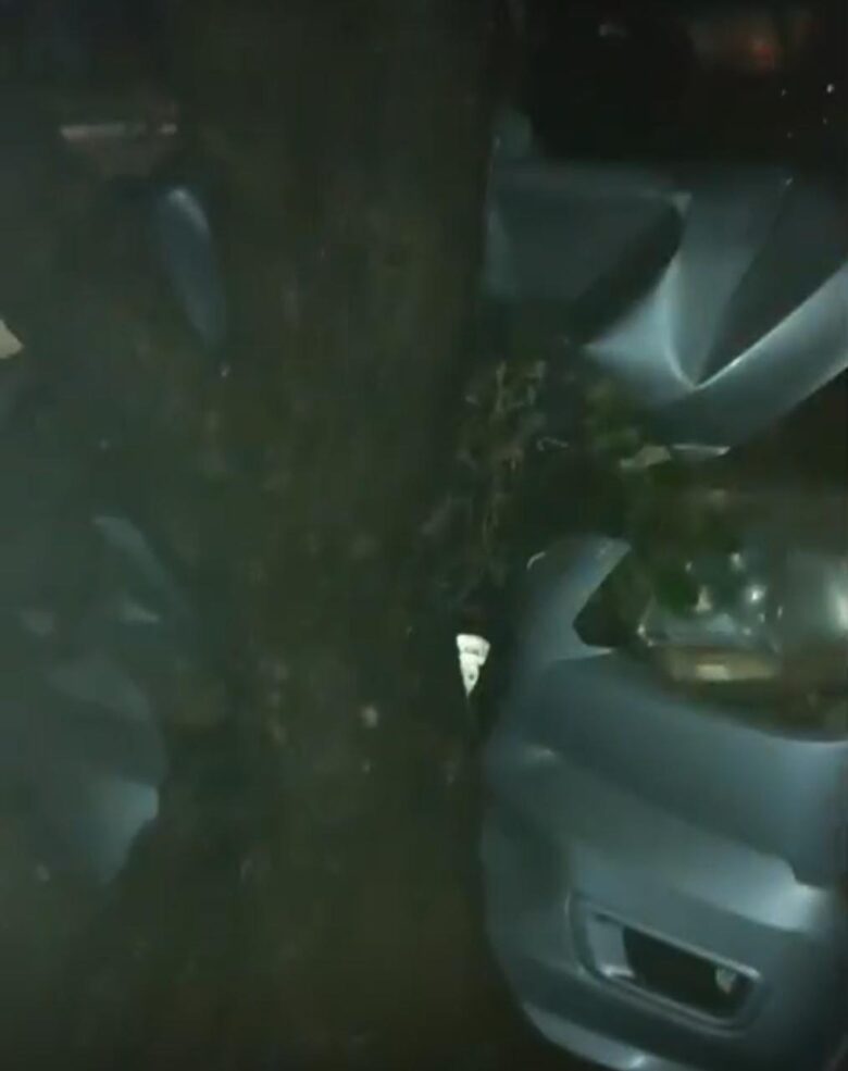O veículo conduzido pela vítima colidiu de forma violenta contra uma árvore. Com o impacto, a parte frontal ficou completamente destruída e os airbags foram acionados.