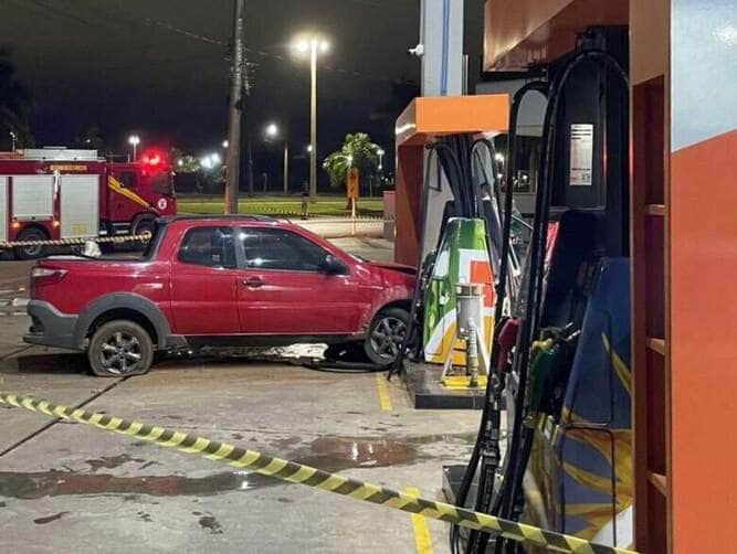Condutora perde direção de veículo colide com bomba de combustível em posto de Lucas do Rio Verde