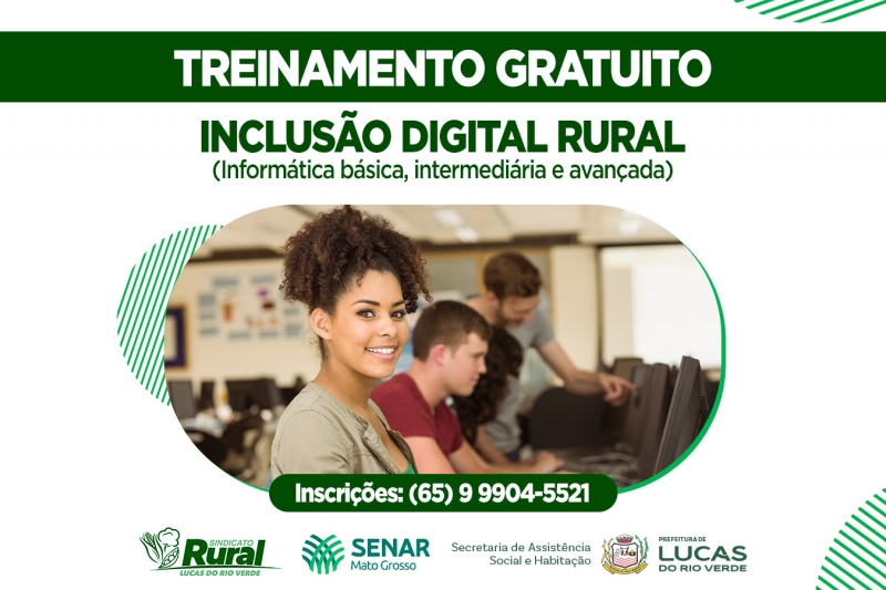 Lucas do Rio Verde recebe em outubro mais uma capacitação do programa gratuito de Inclusão Digital Rural, que busca oferecer formação em informática básica, intermediária e avançada. O treinamento é resultado de uma parceria entre o Sindicato Rural, o Serviço Nacional de Aprendizagem Rural (Senar-MT) e a Prefeitura Municipal, por meio da Secretaria de Assistência Social e Habitação.