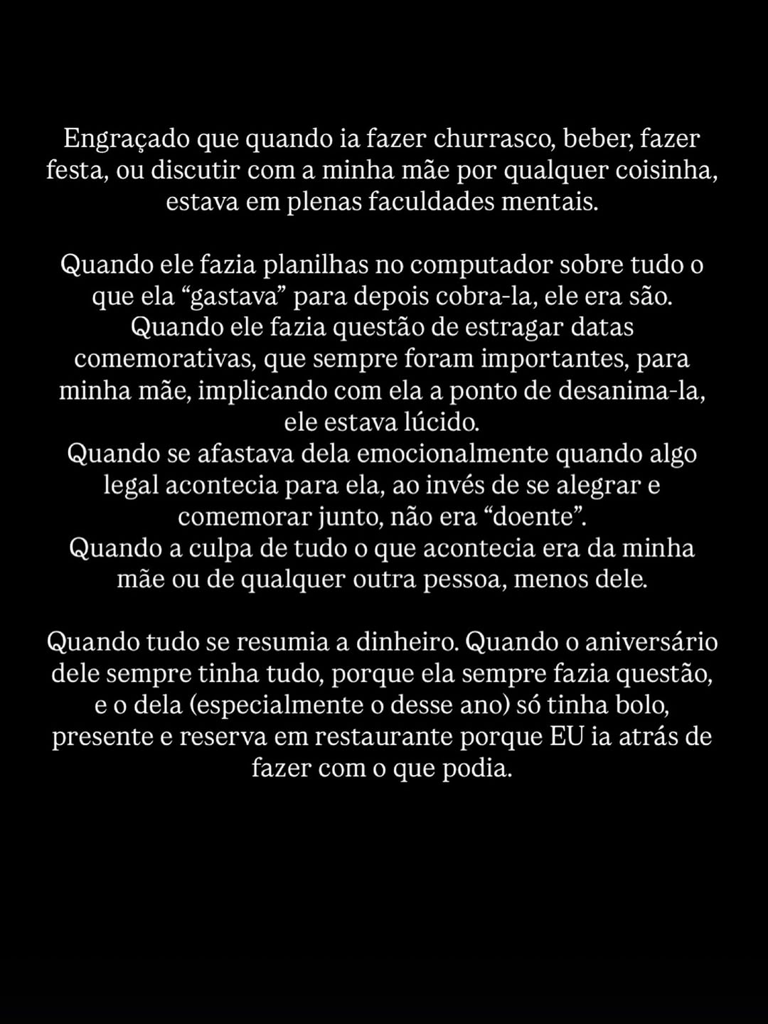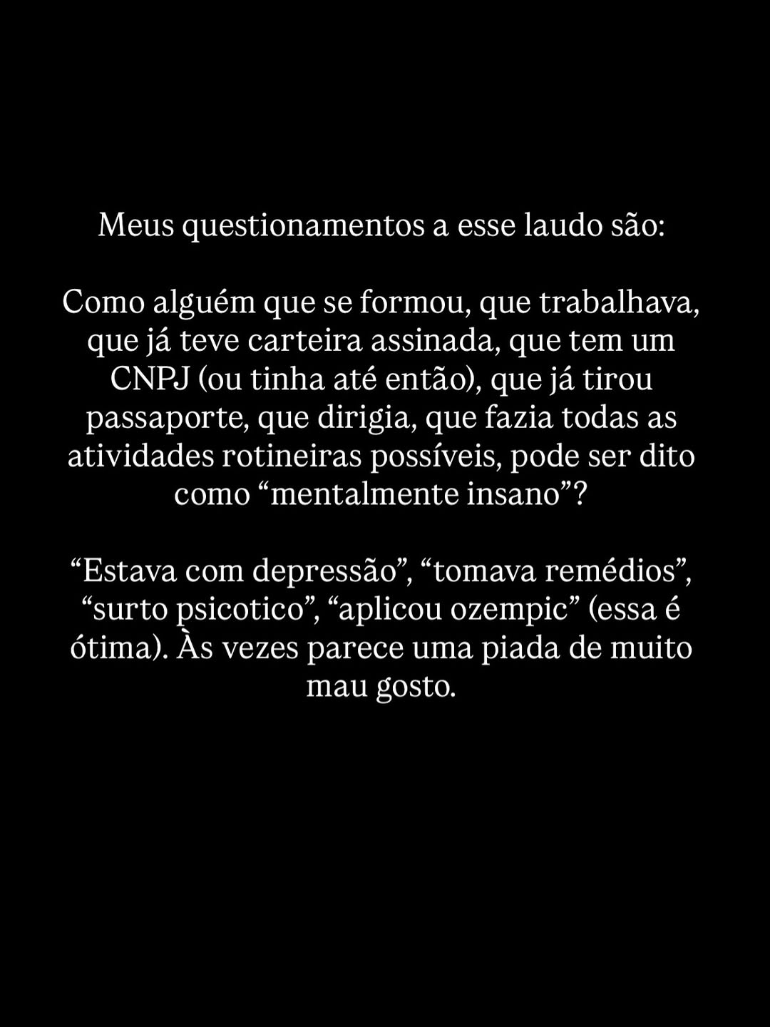 “Como alguém que se formou, que trabalhava, que já teve carteira assinada, que dirigia, que fazia todas as atividades rotineiras possíveis pode ser dito como ‘mentalmente insano’?”, questiona. No relato, ela contesta justificativas apresentadas ao longo do processo, como depressão, uso de medicamentos ou supostos surtos psicóticos. “Às vezes parece uma piada de muito mau gosto”, desabafa.