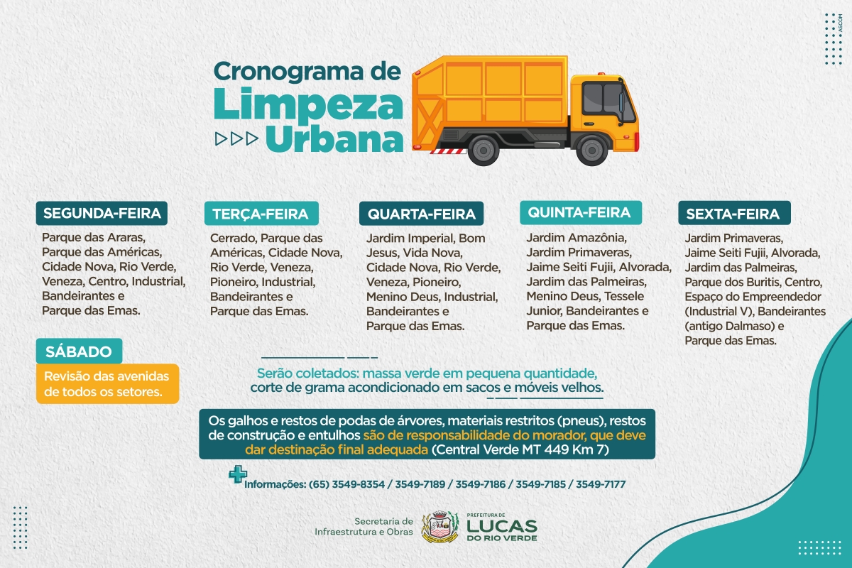 Confira abaixo o cronograma de coleta de resíduos e de limpeza urbana: