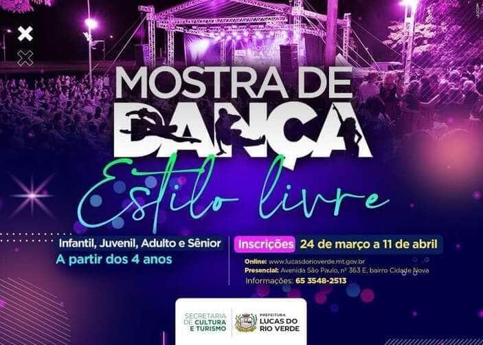 A Prefeitura de Lucas do Rio Verde, por meio da Secretaria de Cultura e Turismo, informa que as inscrições para a Mostra de Dança Estilo Livre serão abertas no dia 24 de março e seguem até 11 de abril. Os interessados podem se inscrever on-line, através do link https://docs.google.com/forms/d/e/1FAIpQLSez0Hlq7DvJACG39KjnpgiqvTmoH9OPj4GdJxIlkU9mOc43KQ/viewform, ou presencialmente na Secretaria de Cultura e Turismo.
